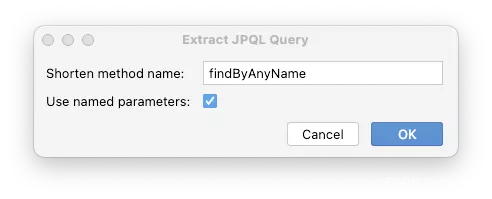 JPA Buddy 分析派生的方法名称,并允许我们通过重命名 JPQL 查询并将其移动到@Query注释来重构它:
