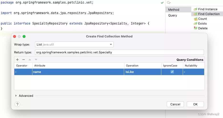 创建数据模型后,下一步是实现数据访问存储库。Spring Data JPA可能是最流行的框架。JPA Buddy 允许我们根据实体定义生成新的存储库。在存储库代码中,我们可以使用 JPA 调色板使用可视化工具在存储库代码中创建各种派生方法和查询: