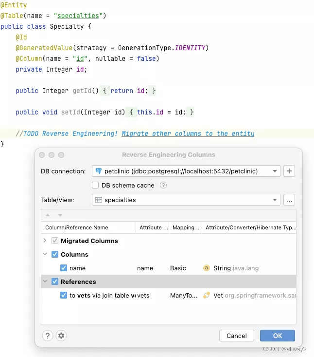 JPA Buddy 生成“空”实体,其中只有一个 ID 列,正文中有一个 TODO 注释,用于此类关联。通过单击此 TODO,我们可以为现有实体运行列导入过程: