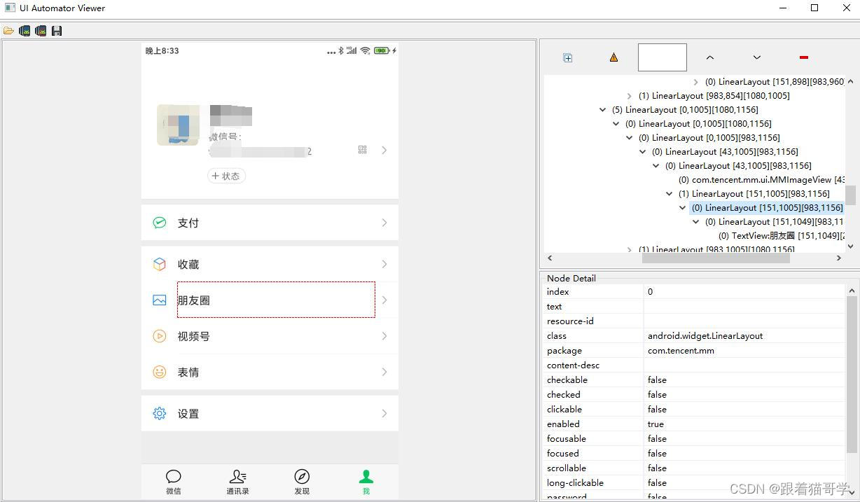 public class AutoChatService extends AccessibilityService {//AccessibilityEvent是一个事件类,里面封装了许多字段,表示各种不同的事件(通知、窗口内容)@Overridepublic void onAccessibilityEvent(AccessibilityEvent event) {String packageName = event.getPackageName().toString();String className = event.getClassName().toString();LogUtils.i("event from:", packageName, className);AccessibilityNodeInfo root = this.getRootInActiveWindow();//先获取tabhost[微信,通讯录,发现,我], 微信的右上角是否有红色小圈,微信上的控件List wechatBadgeList = root.findAccessibilityNodeInfosByViewId("com.tencent.mm:id/j0_");}