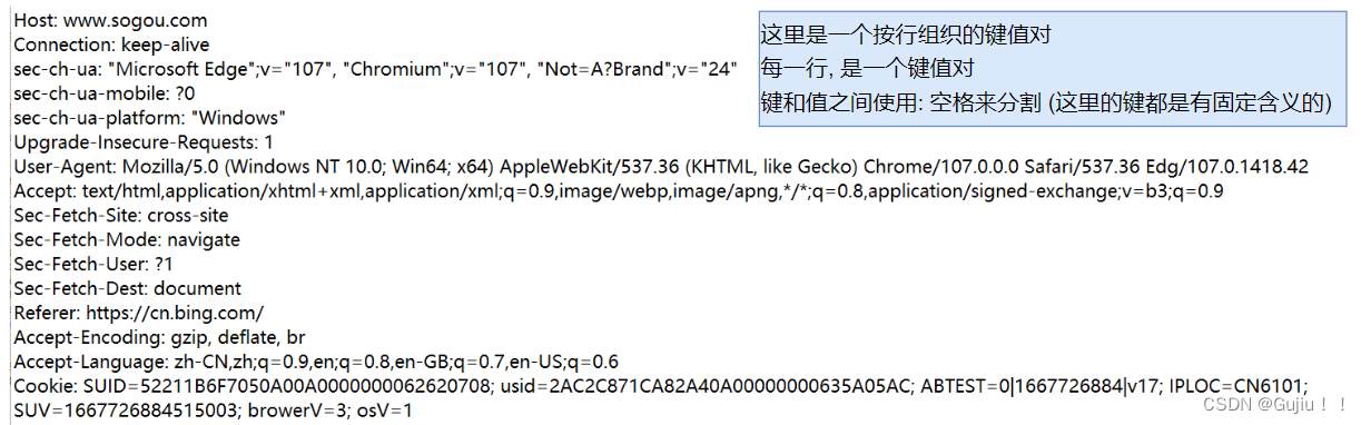 # 注意 #HTTP header 也是有很多键值对, 这里的键和值大多都是标准规定好的(虽然也可以有自定义的, 但是以标准的为主)而 URL 里面的 查询字符串, 键值对, 完全是自定义的