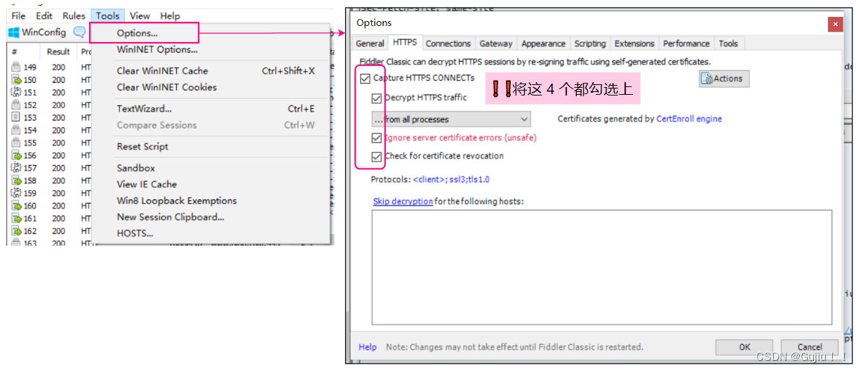 需要开启 fiddler 抓取 HTTPS 的功能 (现在互联网上纯 HTTP 很少了, 更多的是 HTTPS . HTTPS 可以理解成升级版本的 HTTP, 在 HTTP 的基础上, 加了个加密层)