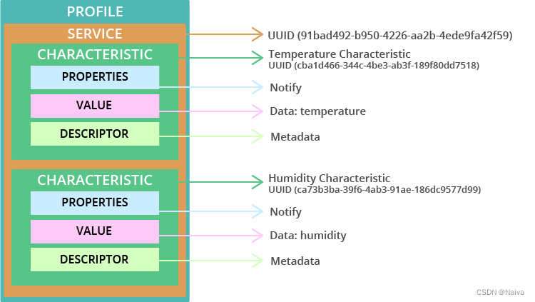 每个服务、特征和描述符都有一个UUID(通用唯一标识符),UUID用于唯一标识信息,它可以识别蓝牙设备提供的特定服务。