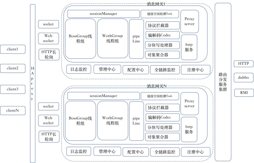 10.路由分发服务:主要是通过注册中心,知道某个用户的连接在具体哪一台机器,后端无需关注用户登录在什么机器,只需要知道用户的ID,就可以对用户所登录在线的机器发送消息,由路由分发服务来找到对应的网关,对外暴露dubbo\RMI\http协议,满足不同调用需求。