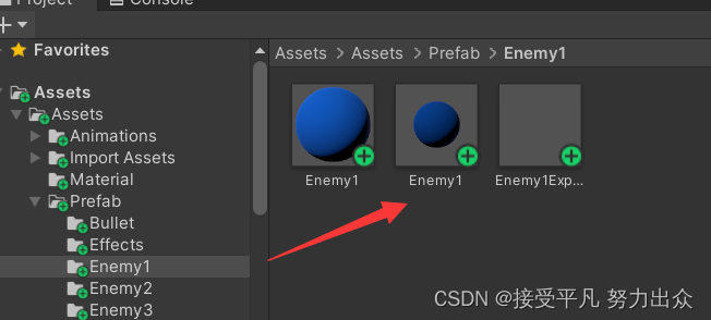 这里简单的就拿做不同颜色的小球,当作不同的敌人,然后创建一个预制体"Prefab"文件夹,把不同的敌人放进文件夹中,如下所示: