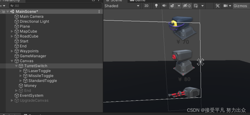 首先在Prefab文件中创建三种炮台和三种炮台升级后的炮台:将第一个激光炮塔放置到0点上的Cube位置进行调整,j将资源里的材质啥的往合适的地方塞,弄好看了然后命名并设置成LaserTurret预制体,将升级后的命名为LaserTurretUpgraded,同理弄完MissileTurret、MissileTurretUpgraded、StandardTurret、StandardTurretUpgraded。