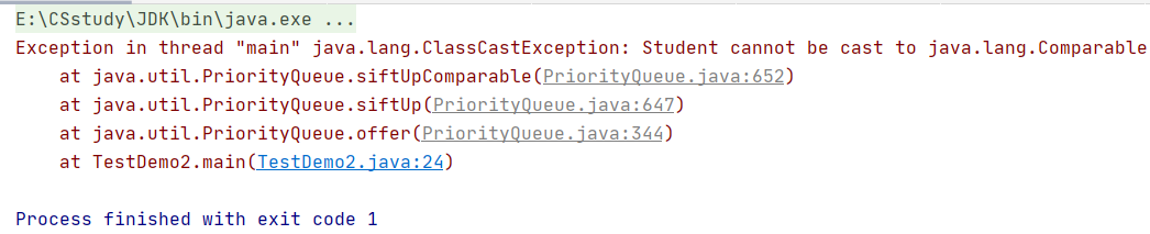 // 注意:默认情况下,PriorityQueue队列是小堆,如果需要大堆需要用户提供比较器public static void main(String[] args) {PriorityQueue priorityQueue = new PriorityQueue<>();priorityQueue.offer(new Student(10));priorityQueue.offer(new Student(5));}