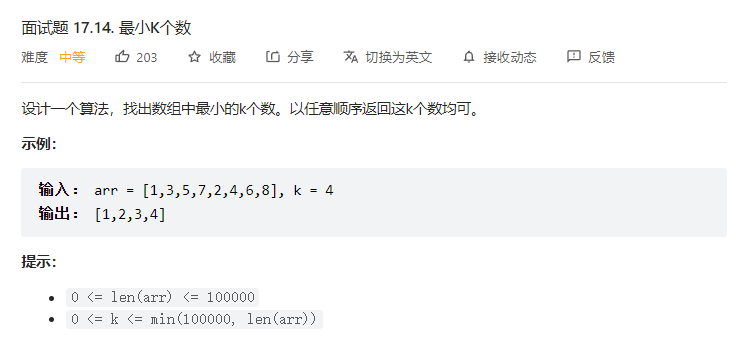 class Solution{public int[] smallestK(int[] arr,int k){PriorityQueue pr = new PriorityQueue<>();for(int i = 0 ;i < arr.length ;i++){pr.offer(arr[i]);}int[] tmp = new int[k];for(int i = 0 ;i < k ;i ++){tmp[i] = pr.poll();}return tmp;}