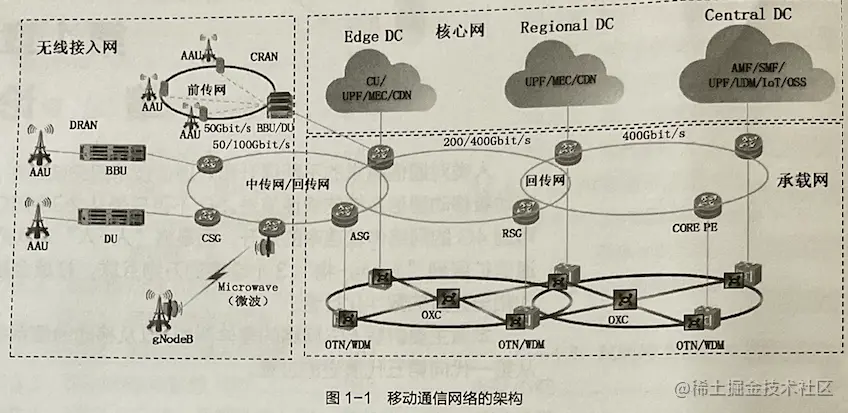 第五代(5thGeneraton, 5G) 移动通信系统网络架构分为无线接入网、承载网、核心网3部分, 如图1-1所示。这3部分的具体介绍如下。