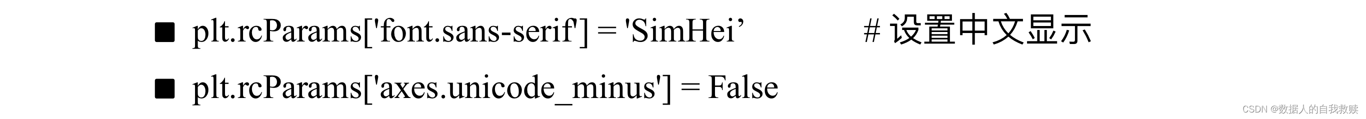 (1)由于默认的pyplot字体并不支持中文字符的显示,因此需要通过设置font.sans-serif参数改变绘图时的字体,使得图形可以正常显示中文。同时,由于更改字体后,会导致坐标轴中的部分字符无法显示,因此需要同时更改axes.unicode_minus参数。