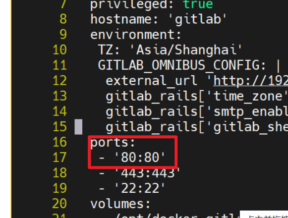 services:gitlab:image: 'twang2218/gitlab-ce-zh:11.1.4'container_name: "gitlab"restart: alwaysprivileged: truehostname: 'gitlab'environment:TZ: 'Asia/Shanghai'GITLAB_OMNIBUS_CONFIG: |external_url 'http://192.168.199.110'gitlab_rails['time_zone'] = 'Asia/Shanghai'gitlab_rails['smtp_enable'] = truegitlab_rails['gitlab_shell_ssh_port'] = 22ports:- '80:80'- '443:443'- '22:22'volumes:- /opt/docker_gitlab/config:/etc/gitlab- /opt/docker_gitlab/data:/var/opt/gitlab- /opt/docker_gitlab/logs:/var/log/gitlab