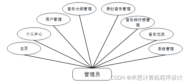 (3)管理员模块中的用户角色是管理员,管理员通过系统对可以实现网站系统管理,主要包括主页、个人中心、用户管理、音乐分类管理、原创音乐管理、音乐排行榜管理、音乐交流、系统管理等功能。管理员模块用例图如图3-3所示。