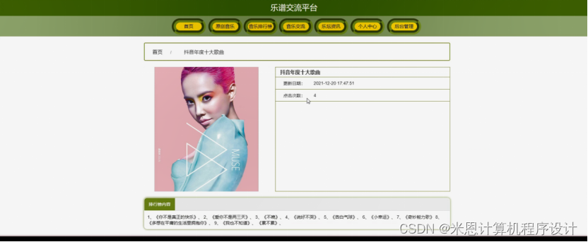 音乐排行榜,在音乐排行榜页面可以查看音乐名称、更新日期、图片、点击次数、排行榜内容等详细内容,如图5-5所示。