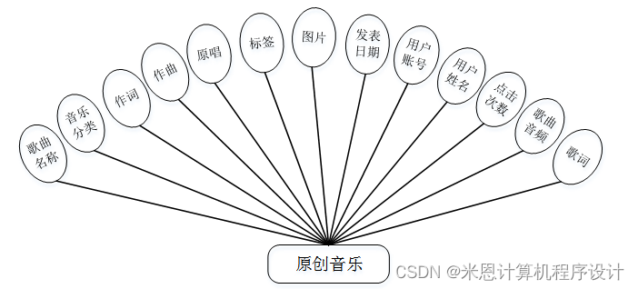 原创音乐实体包括歌曲名称、音乐分类、作词、作曲、原唱、标签、图片、发表日期、用户账号、用户姓名、点击次数、歌曲音频、歌词等属性;原创音乐实体图如图4-3所示: