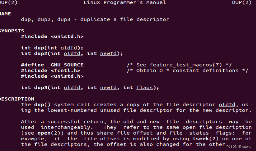 返回值:成功时将返回一个新的文件描述符,由操作系统分配,分配置原则遵循文件描述符分配原则;如果复制失败将返回-1,并且会设置 errno 值。