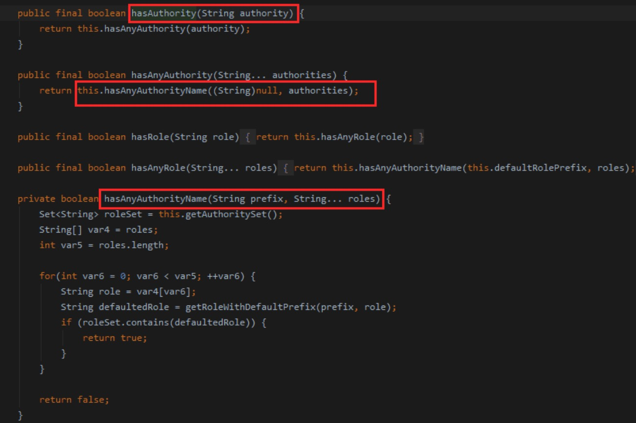 public class UserServiceImpl implements UserService {undefined@PreAuthorize("hasRole('ROLE_ADMIN')")public void addUser(User user) {undefinedSystem.out.println("addUser................" + user);}@PreAuthorize("hasRole('ROLE_USER') or hasRole('ROLE_ADMIN')")public User find(int id) {undefinedSystem.out.println("find user by id............." + id);return null;}