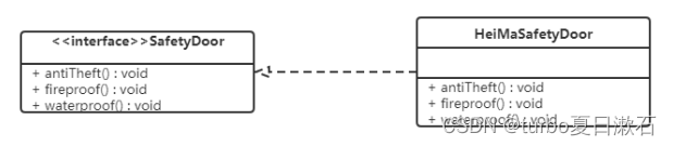 它存在的问题,黑马品牌的安全门具有防盗,防水,防火的功能。现在如果我们还需要再创建一个传智品牌的安全门,而该安全门只具有防盗、防水功能呢?很显然如果实现SafetyDoor接口就违背了接口隔离原则,那么我们如何进行修改呢?