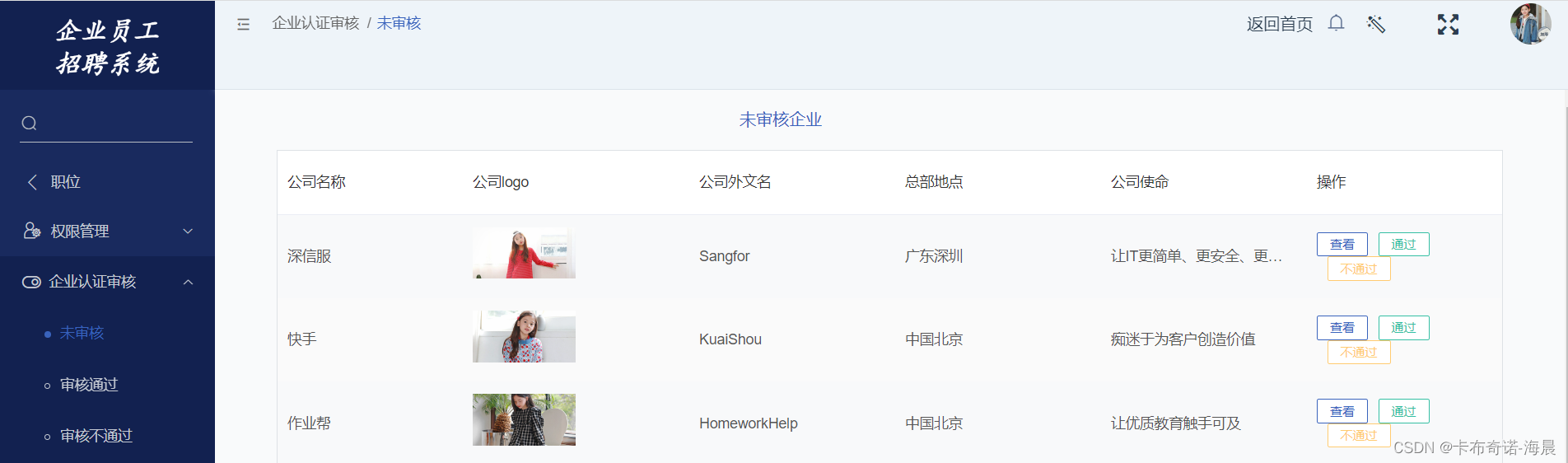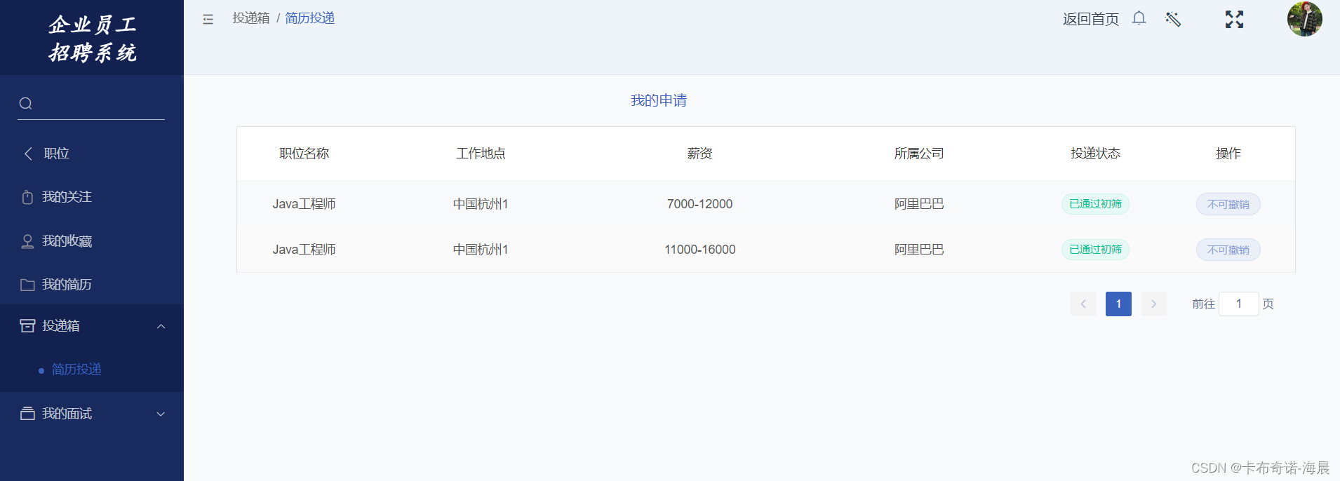 public class ApplicationController {@Autowiredprivate ApplicationService applicationService;@Autowiredprivate InterviewService interviewService;/*** 投递简历——添加申请* @return CreatedVO*/@Logger(template = "投递简历")@PostMapping("")@GroupRequired@PermissionMeta(value = "投递简历")public CreatedVO create(@RequestBody ApplicationDO applicationDO) {applicationService.create(applicationDO);return new CreatedVO(7000);}/*** 根据申请id修改状态state* @param id id* @param state state* @return UpdatedVO*/@Logger(template = "处理简历")@PutMapping("/state/{id}")@GroupRequired@PermissionMeta(value = "申请审核")public UpdatedVO update(@PathVariable @Positive(message = "{id.positive}") Integer id,@RequestParam Integer state) {// 根据id查找申请ApplicationDO applicationDO = applicationService.getById(id);if (applicationDO == null) {throw new NotFoundException(70000);}// 更新申请状态applicationService.updateState(id, state);// 若简历通过则插入面试表,初始状态为0,未面试if(state==1){InterviewDO interviewDO=new InterviewDO();interviewDO.setResumeId(applicationDO.getResumeId());interviewDO.setHrId(applicationDO.getHrId());interviewDO.setUserId(applicationDO.getUserId());interviewDO.setCompanyId(applicationDO.getCompanyId());interviewDO.setPositionId(applicationDO.getPositionId());interviewDO.setStatus(0);interviewService.getBaseMapper().insert(interviewDO);}return new UpdatedVO(7100);}/*** 根据id撤销申请(只有未处理的申请才可以撤销,即state=0的申请才可以撤销)* @param id id* @return DeletedVO*/@Logger(template = "撤销职位申请")@DeleteMapping("/{id}")@GroupRequired@PermissionMeta(value = "撤销申请")public DeletedVO delete(@PathVariable @Positive(message = "{id.positive}") Integer id) {// 根据id查找申请ApplicationDO applicationDO = applicationService.getById(id);if (applicationDO == null) {throw new NotFoundException(70000);}applicationService.removeById(id);return new DeletedVO(7200);}/*** 根据用户id和职位id查询申请表,避免重复投递同个岗位* @param positionId positionId* @param userId userId* @return Boolean*/@GetMapping("")public Boolean get(@RequestParam Integer positionId, @RequestParam Integer userId) {QueryWrapper wrapper = new QueryWrapper<>();wrapper.eq("position_id", positionId).eq("user_id", userId);ApplicationDO applicationDO = applicationService.getOne(wrapper);if (applicationDO == null) {return true;}return false;}/*** 根据hr_id查询该hr接收到的所有简历,并且根据state区分申请的状态* @param count count* @param page page* @param hrID hrID* @param state state* @return 应聘简历*/@Logger(template = "查看应聘简历")@GetMapping("/page/{hrID}")@GroupRequired@PermissionMeta(value = "简历管理")public PageResponseVO page(@RequestParam(name = "count", required = false, defaultValue = "10")@Min(value = 1, message = "{page.count.min}")@Max(value = 30, message = "{page.count.max}") Integer count,@RequestParam(name = "page", required = false, defaultValue = "0")@Min(value = 0, message = "{page.number.min}") Integer page,@PathVariable(value = "hrID") @Positive(message = "{id.positive}") Integer hrID,@RequestParam Integer state) {return applicationService.getByHrId(count, page, hrID, state);}/*** 根据hr_id查询该hr接收到的所有简历,并且根据简历的分数进行排序* @param count count* @param page page* @param hrID hrID* @return 简历排序*/@GroupRequired@PermissionMeta(value = "简历排序")@GetMapping("/sort/{hrID}")public PageResponseVO sort(@RequestParam(name = "count", required = false, defaultValue = "10")@Min(value = 1, message = "{page.count.min}")@Max(value = 30, message = "{page.count.max}") Integer count,@RequestParam(name = "page", required = false, defaultValue = "0")@Min(value = 0, message = "{page.number.min}") Integer page,@PathVariable(value = "hrID") @Positive(message = "{id.positive}") Integer hrID) {return applicationService.sort(count, page, hrID);}/*** 根据user_id查询用户的所有申请,并且根据state区分申请的状态* @param count count* @param page page* @param userId userId* @return 我的投递箱*/@Logger(template = "查看简历投递状况")@GetMapping("/page/find/{userId}")@GroupRequired@PermissionMeta(value = "我的投递箱")public PageResponseVO pageByUserId(@RequestParam(name = "count", required = false, defaultValue = "10")@Min(value = 1, message = "{page.count.min}")@Max(value = 30, message = "{page.count.max}") Integer count,@RequestParam(name = "page", required = false, defaultValue = "0")@Min(value = 0, message = "{page.number.min}") Integer page,@PathVariable(value = "userId") @Positive(message = "{id.positive}") Integer userId) {PageResponseVO res = applicationService.getByUserId(count, page, userId);return res;}