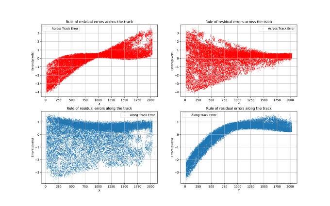 第一行为一个数字,表示当前文件共有多少行数据。 第二行开始为真正的数据,各数据间以一个Tab分隔。第一列是数据点ID名,第二列是X坐标,第三列是Y坐标,第四、五列暂时用不到,不用管它。第六列是垂轨误差,第七列是沿轨误差。我们要画的一共是4个图,即X方向的垂轨误差图、X方向的沿轨误差图、Y方向的垂轨误差图、Y方向的沿轨误差图。简单解释一下例如X方向的垂轨误差图就是以读取的X坐标为X轴,垂轨误差为Y轴绘制散点图。要使用Matplotlab绘图需要两步,第一步是读取数据,第二部是调用函数绘图。
