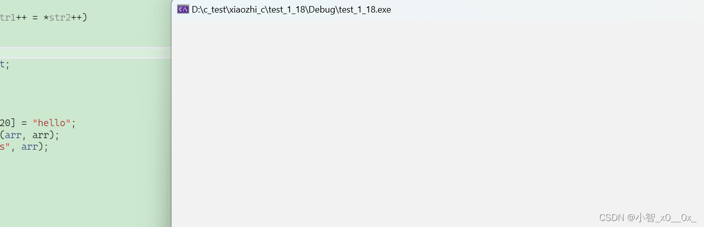 {char str[20] = "";char* p = "hello world!";my_strcpy(str, p);printf("%s", str);return 0;