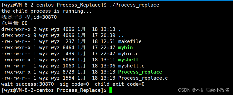 {pid_t id=fork();if(id==0){printf("the child process is running...\n");printf("我是子进程,id=%d\n",getpid());sleep(1);//法一:execl 列表传命令//execl("/usr/bin/ls","ls","--color=auto",NULL);//系统命令//execl("./mybin","mybin",NULL);//自己编写的程序//法二:execlp 环境变量PATH//execlp("ls","ls","--color=auto",NULL);//法三:execv 数组传命令// char* const _argv[]={// "ls",// "-a",// "-l",// "--color=auto",// NULL// };//execv("/usr/bin/ls",_argv);//法四:execvp 二和三的组合// char* const _argv[]={// "ls",// "-a",// "-l",// "--color=auto",// NULL// };// execvp("ls",_argv);//法五:execle 获取环境变量extern char**environ;char* const _envp[]={"myval=666",NULL};putenv("myval=666");//自己设置环境变量execle("./mybin","mybin",NULL,environ);exit(-1);//进程替换失败}else if(id>0){int status=0;pid_t ret=waitpid(id,&status,0);sleep(3);if(ret>0)printf("wait success:%d sig code=%d child exit code=%d\n",ret,status&0X7F,(status>>8)&0XFFFF);}else{printf("creat child process error!\n");}return 0;