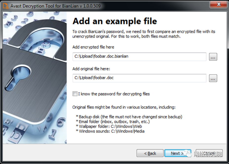 用户可以选择他们希望解密的位置,并为软件提供一对原始/加密文件。