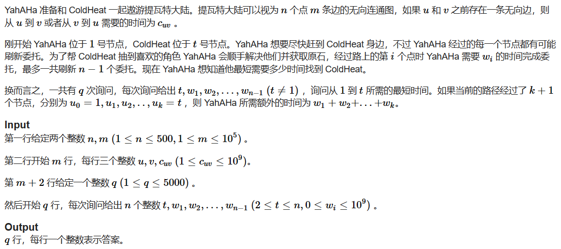 std::vector vec[N];int main() {std::ios::sync_with_stdio(false);std::cin.tie(0);std::cout.tie(0);std::cin >> n >> m;for(int i = 1; i <= m; i ++) {int u, v, w;std::cin >> u >> v >> w;vec[u].push_back({v, w});vec[v].push_back({u, w});}for(int i = 0; i <= n; i ++) {for(int j = 0; j <= n; j ++) {dis[i][j] = 3e18;}}dis[0][1] = 0;for(int i = 1; i <= n; i ++) {for(int j = 1; j <= n; j ++) {for(auto [u, w] : vec[j]) {dis[i][j] = std::min(dis[i][j], dis[i - 1][u] + w);}}}std::cin >> q;while(q --) {std::cin >> t;ll sum = 0, ans = 3e18;for(int i = 1; i < n; i ++) {std::cin >> x;sum += x;ans = std::min(ans, dis[i][t] + sum);}std::cout << ans << '\n';}return 0;