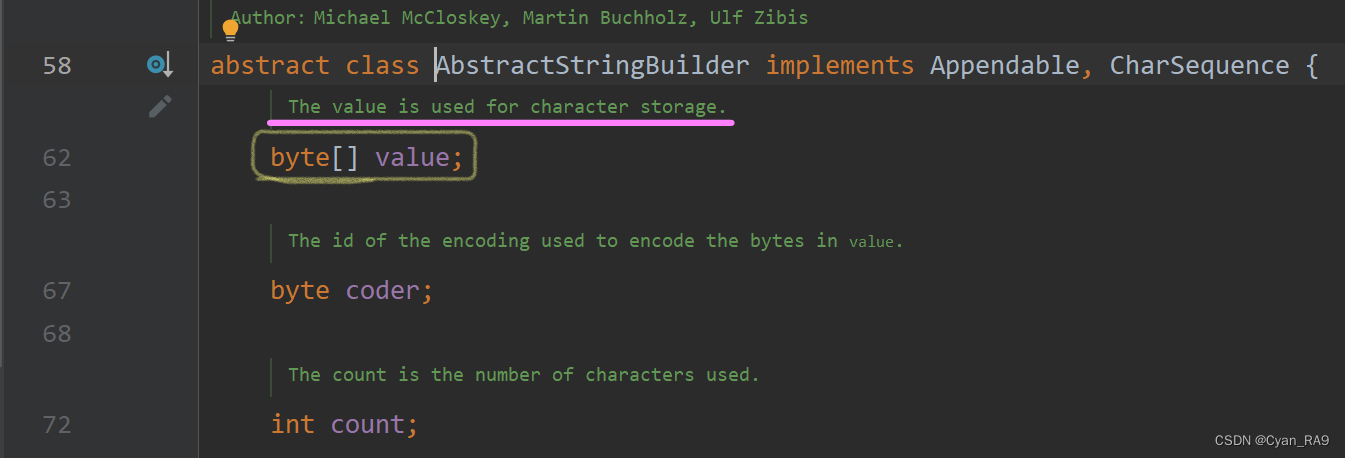 大家可以通过侧边栏跳转回StringBuffer类的类图看看,up表示,不能说一模一样,但至少是完全相同😋。很明显,这俩是难兄难弟。同样的,StringBuilder类也实现了Serializable接口,使得StringBuilder类对象串行化,串行化后,对象可以进行网络传输,也可以保存到文件。同样的,StringBuilder类也继承了AbstractStringBuilder类,那自然也是在AbstractStringBuilder类中的byte[] value中来保存字符串的。