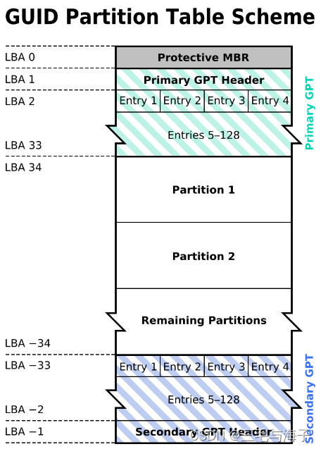 上面有Primary GPT Header ( 主区 ) ,下面有 Secondary GPT Header(备区)
