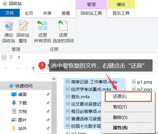 (2)查找被删除的文件:在回收站窗口中找到被误删的文件,右键点击文件,然后选择【还原】即可。