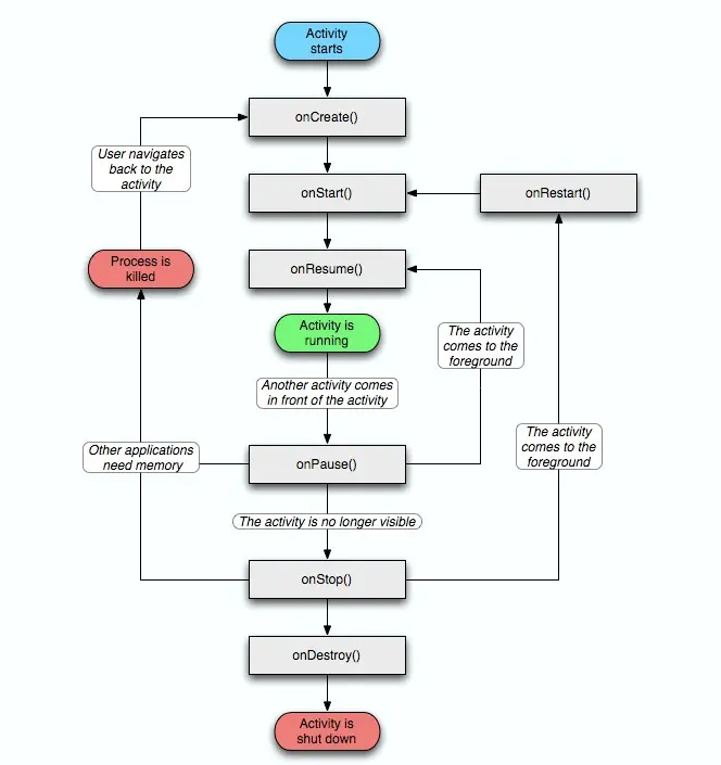 相信学习安卓的人对这幅图都很熟悉,这是安卓Activity的生命周期活动图,详细而直观得表现了Activity各生命周期间的关系。下面我来通过问答的方式来谈谈我对它们的认识。