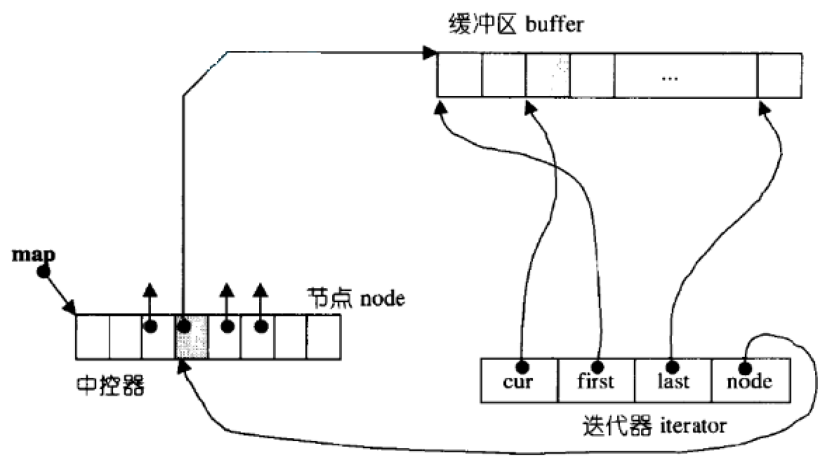 2.双端队列底层是一段假象的连续空间,实际是分段连续的,为了维护其“整体连续”以及随机访问的假象,落 在了deque的迭代器身上,因此deque的迭代器设计就比较复杂,如下图所示: