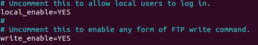sudo apt-get install vsftpd打开/etc/vsftpd.conf 找到如下两行,确保上面两行前面没有“#”,有的话就取消掉。