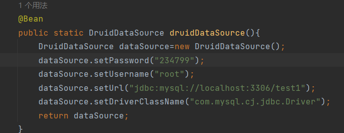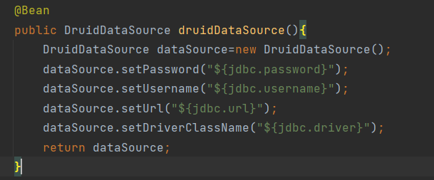 datasource的bean方法创建,datasource依赖于外部的数据源druid,所以又要先创建一个DruidDataSource的bean方法,DruidDataSource又依赖于一个db.properties,这里可以在配置类上使用一个注解@PropertySource("db.properties")把需要的信息加载进来,在里面再使用参数占位符${}的方式加载信息,再加上一个@bean放入容器