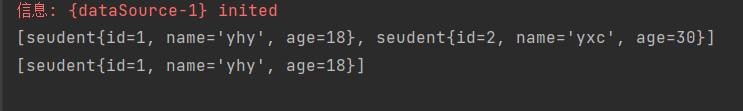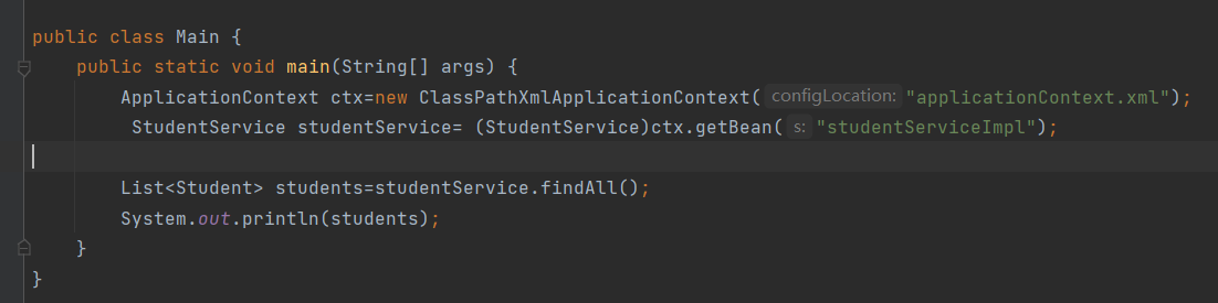 public class Main {public static void main(String[] args) {ApplicationContext ctx=new ClassPathXmlApplicationContext("applicationContext.xml");StudentService studentService= (StudentService)ctx.getBean("studentService");Student student=new Student();student.setId(1);student.setName("yhy");student.setAge(18);Student student2=new Student();student2.setId(2);student2.setName("yxc");student2.setAge(30);studentService.add(student);studentService.add(student2);List students=studentService.findAll();System.out.println(students);studentService.remove(2);students=studentService.findAll();System.out.println(students);}