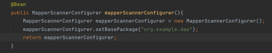 public class SpringConfig {@Beanpublic static SqlSessionFactoryBean sqlSessionFactoryBean() throws IOException {SqlSessionFactoryBean sbean=new SqlSessionFactoryBean();sbean.setTypeAliasesPackage("org.example.pojo");sbean.setDataSource(druidDataSource());sbean.setMapperLocations(new PathMatchingResourcePatternResolver().getResources("classpath:mapper/*.xml"));return sbean;}@Beanpublic static DruidDataSource druidDataSource(){DruidDataSource dataSource=new DruidDataSource();dataSource.setPassword("${jdbc.password}");dataSource.setUsername("${jdbc.username}");dataSource.setUrl("${jdbc.url}");dataSource.setDriverClassName("${jdbc.driver}");return dataSource;}@Beanpublic static MapperScannerConfigurer mapperScannerConfigurer(){MapperScannerConfigurer mapperScannerConfigurer = new MapperScannerConfigurer();mapperScannerConfigurer.setBasePackage("org.example.dao");return mapperScannerConfigurer;}
