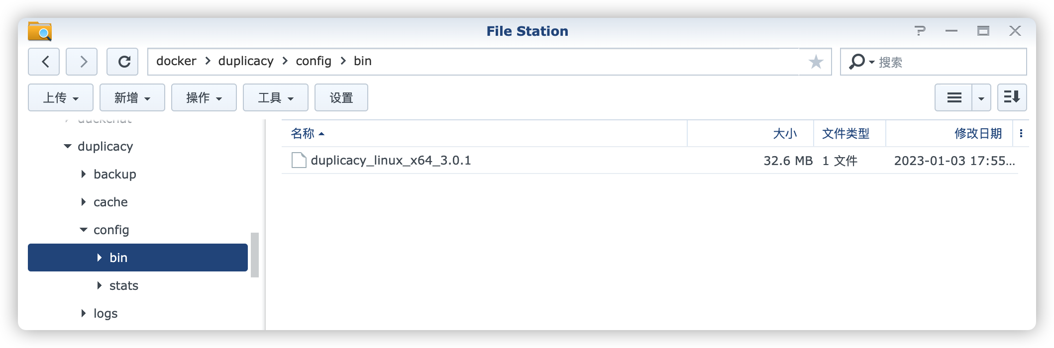 将下载的 duplicacy_linux_x64_3.0.1 文件上传到 /docker/duplicacy/config/bin 目录中