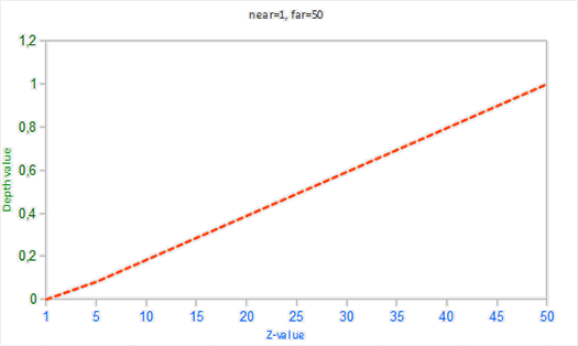 由于非线性方程与 1/z 成正比,在1.0和2.0之间的z值将会变换至1.0到0.5之间的深度值,这就是一个float提供给我们的一半精度了,这在z值很小的情况下提供了非常大的精度。在50.0和100.0之间的z值将会只占**2%**的float精度