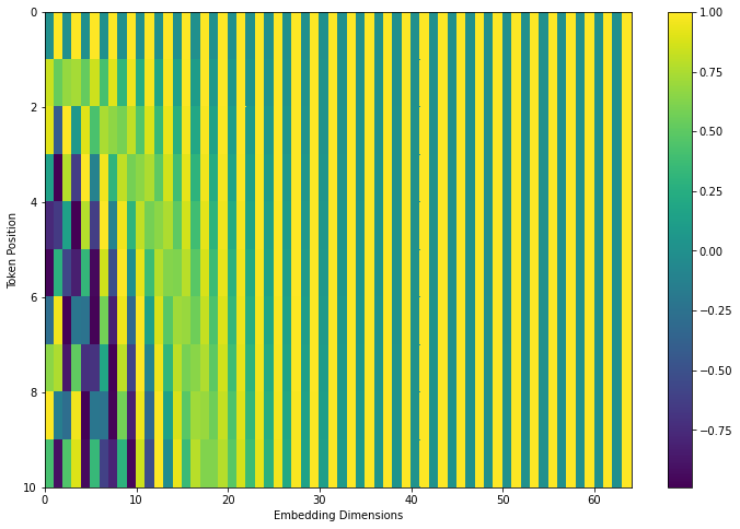 plt.show()通过对嵌入向量交替的进行正弦与余弦最终构成如下图所示的位置编码矩阵。句子10个词(行),嵌入向量64维。
