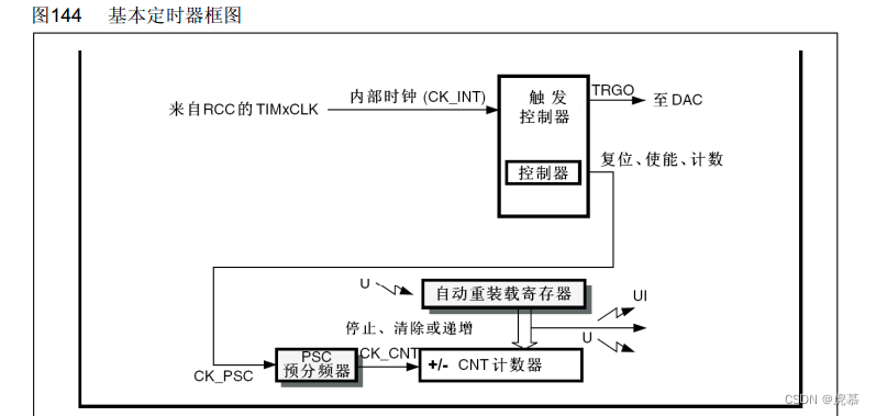 - 折线UI:向上的折线箭头表示该位置会产生中断信号——“更新中断”(由计数值等于自动重装值产生的中断),这个中断信号会通向NVIC。