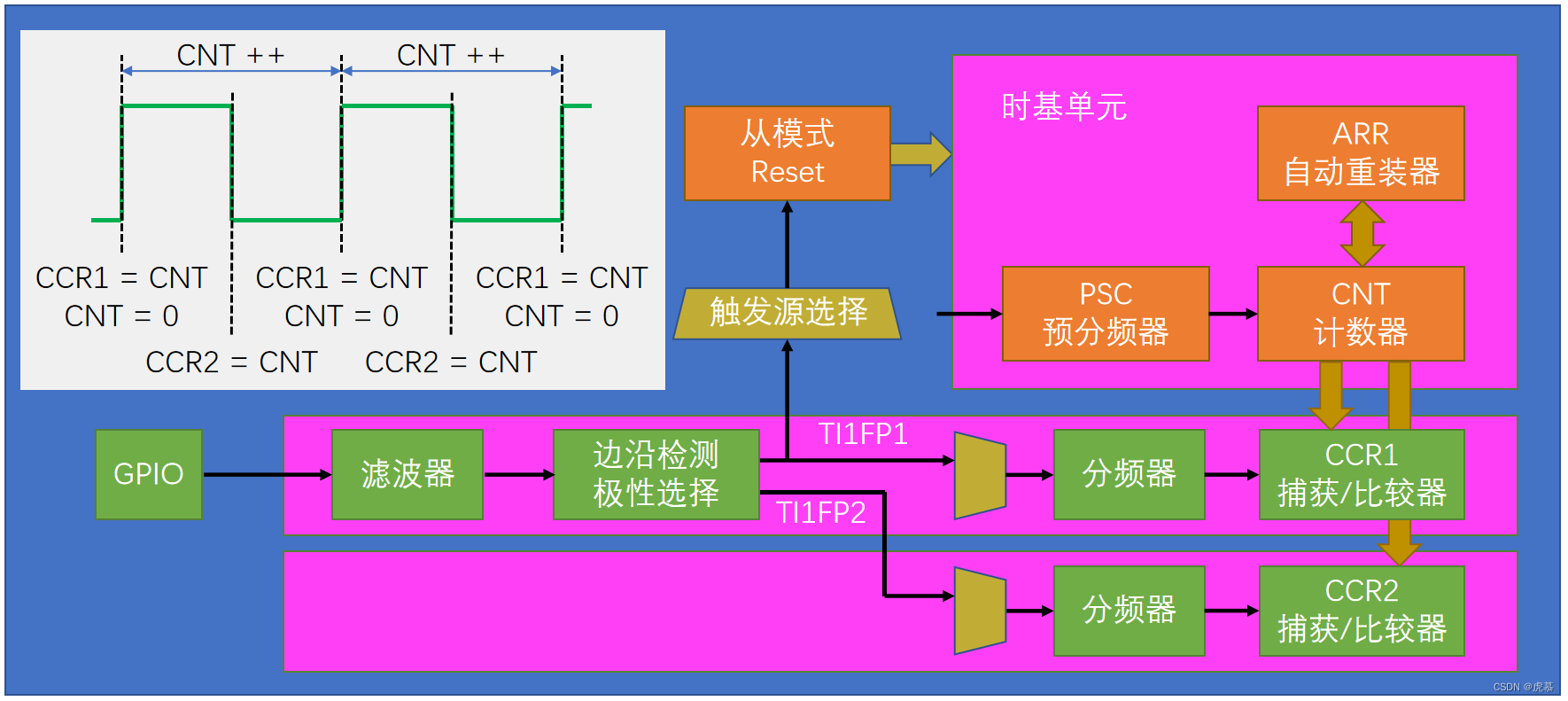 - 从模式控制器:实现硬件自动化操作的利器,可以来自于TI1F_ED、TI1FP1。后续可以配置相应的硬件,在TI1FP1的上升沿对CNT自动清零。下面介绍主从触发模式。