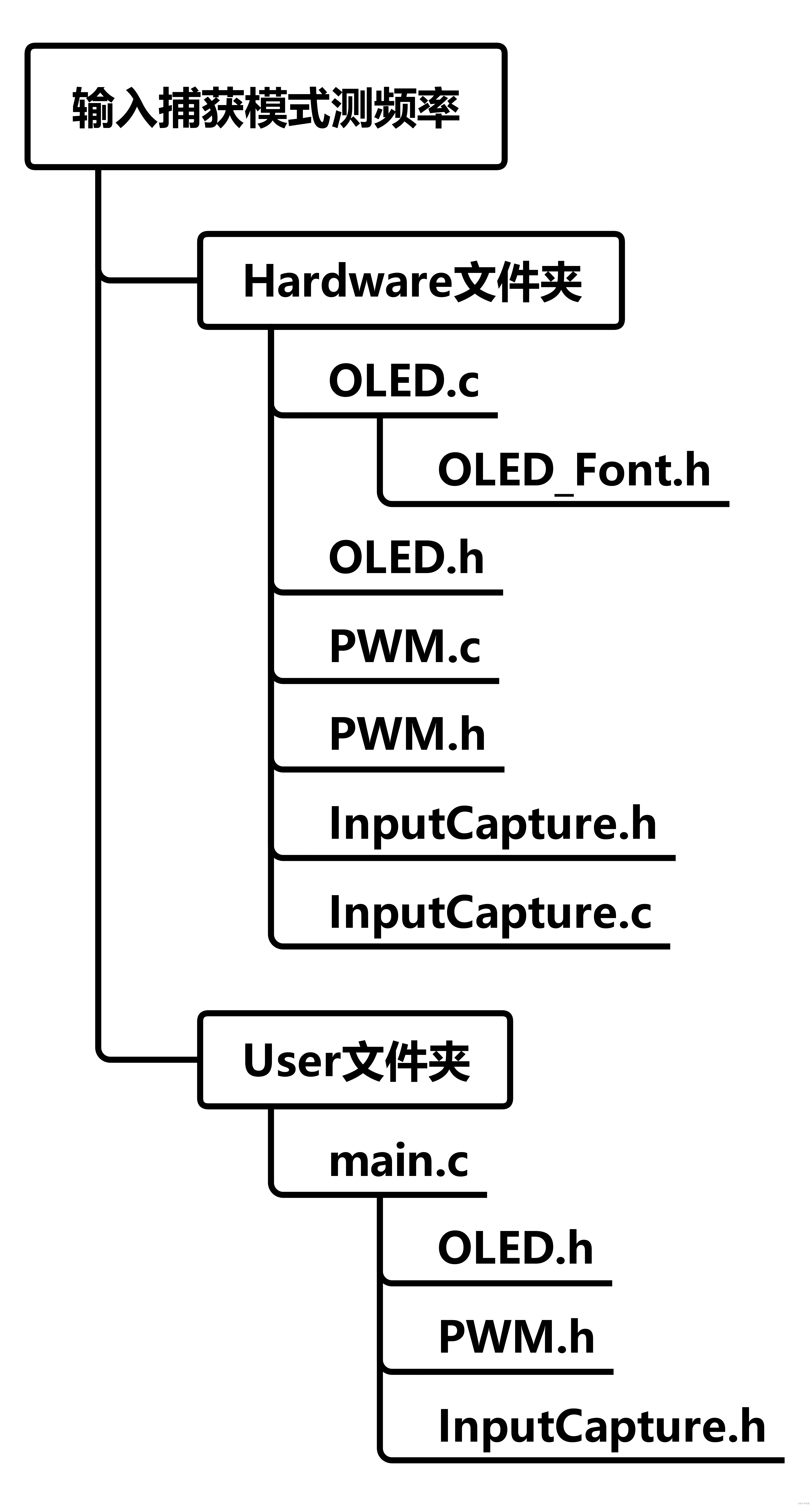 TIM_Cmd。- 计算频率。最后获取输入捕获值计算频率时,由于CNT会在上升沿清零计数器,所以单周期的最后一个小周期可能会由于上升沿的触发而少记一次,所以记得将输入捕获值+1后,再计算频率。这个是测周法固有的误差。