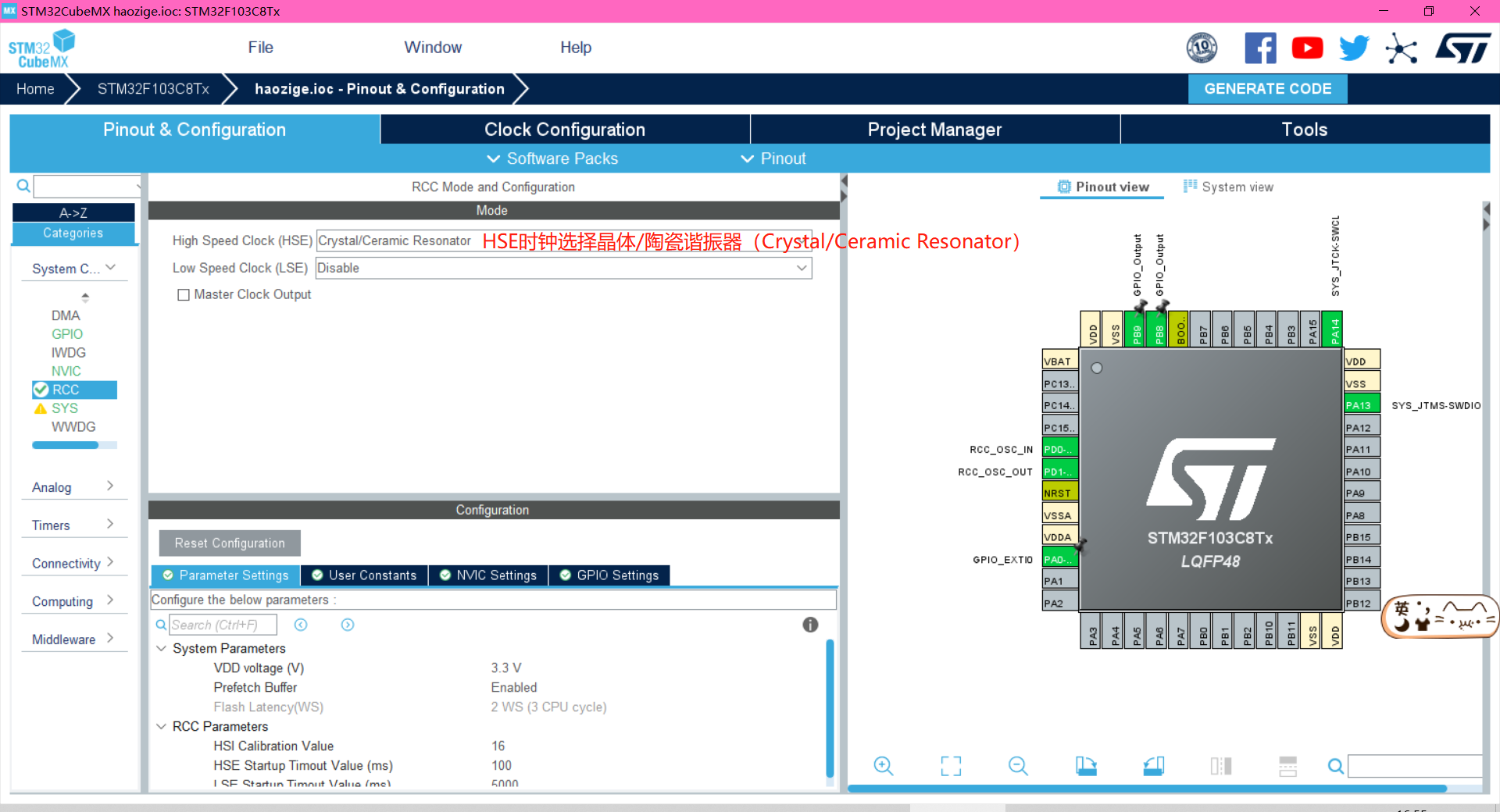 {RCC_OscInitTypeDef RCC_OscInitStruct = {0};RCC_ClkInitTypeDef RCC_ClkInitStruct = {0};RCC_PeriphCLKInitTypeDef PeriphClkInit = {0};/** Initializes the RCC Oscillators according to the specified parameters* in the RCC_OscInitTypeDef structure.*/RCC_OscInitStruct.OscillatorType = RCC_OSCILLATORTYPE_HSE;RCC_OscInitStruct.HSEState = RCC_HSE_ON;RCC_OscInitStruct.HSEPredivValue = RCC_HSE_PREDIV_DIV1;RCC_OscInitStruct.HSIState = RCC_HSI_ON;RCC_OscInitStruct.PLL.PLLState = RCC_PLL_ON;RCC_OscInitStruct.PLL.PLLSource = RCC_PLLSOURCE_HSE;RCC_OscInitStruct.PLL.PLLMUL = RCC_PLL_MUL9;if (HAL_RCC_OscConfig(&RCC_OscInitStruct) != HAL_OK){Error_Handler();}/** Initializes the CPU, AHB and APB buses clocks*/RCC_ClkInitStruct.ClockType = RCC_CLOCKTYPE_HCLK|RCC_CLOCKTYPE_SYSCLK|RCC_CLOCKTYPE_PCLK1|RCC_CLOCKTYPE_PCLK2;RCC_ClkInitStruct.SYSCLKSource = RCC_SYSCLKSOURCE_PLLCLK;RCC_ClkInitStruct.AHBCLKDivider = RCC_SYSCLK_DIV1;RCC_ClkInitStruct.APB1CLKDivider = RCC_HCLK_DIV2;RCC_ClkInitStruct.APB2CLKDivider = RCC_HCLK_DIV1;if (HAL_RCC_ClockConfig(&RCC_ClkInitStruct, FLASH_LATENCY_2) != HAL_OK){Error_Handler();}PeriphClkInit.PeriphClockSelection = RCC_PERIPHCLK_ADC;PeriphClkInit.AdcClockSelection = RCC_ADCPCLK2_DIV6;if (HAL_RCCEx_PeriphCLKConfig(&PeriphClkInit) != HAL_OK){Error_Handler();}