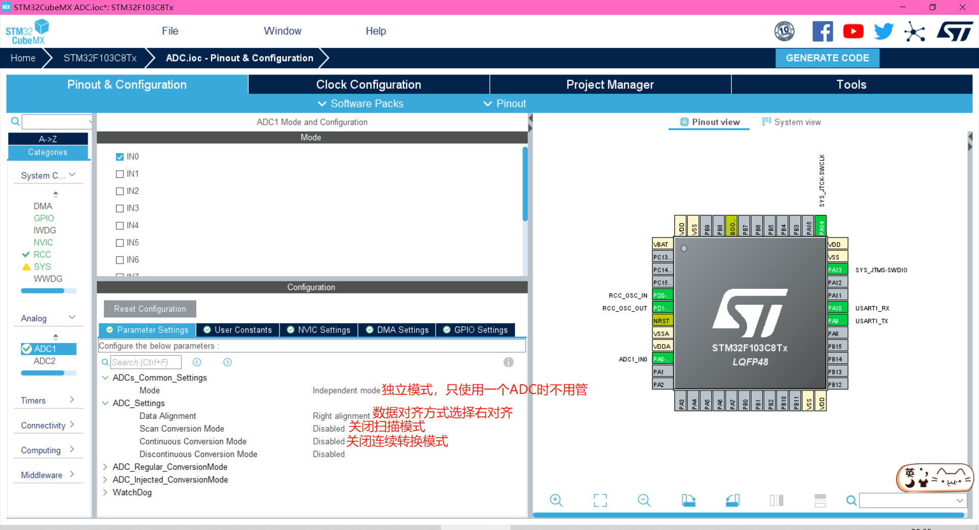 在STM32F103C8T6的产品手册中找到板子上的ADC1通道0的接口。