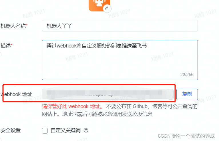 这里可以根据大家日常办公的沟通工具进行选择,比如企业微信、飞书等,简单一点也可以用发邮件的方式。以飞书为例,先建个群,加入飞书机器人,建群完成后,获取webhook地址。