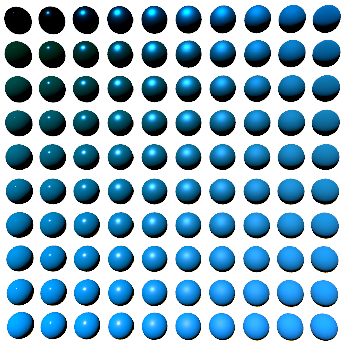 在实际应用中对于某一直接照射到物体表面的光源(往往是方向光源)而言,仅仅计算从该方向照射过来的光照即可。我们将金属度和粗糙度在[0,1]之间插值,设置颜色为蓝色,得到100个小球的渲染结果: