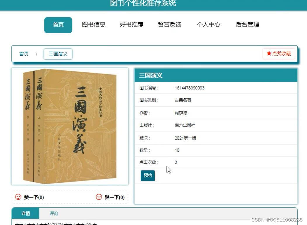 在图书信息页面通过查看图书编号、图书名称、图书类别、图片、作者、出版社、版次、数量、点击次数等信息进行预约、立即提交或点我收藏操作,如图