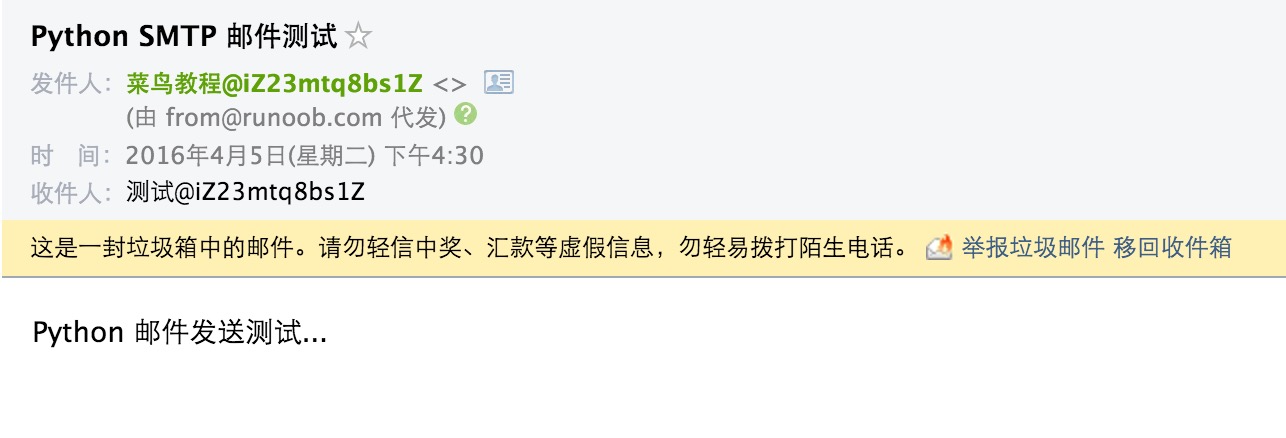 message['Subject'] = Header(subject, 'utf-8')try:smtpObj = smtplib.SMTP('localhost')smtpObj.sendmail(sender, receivers, message.as_string())print ("邮件发送成功")