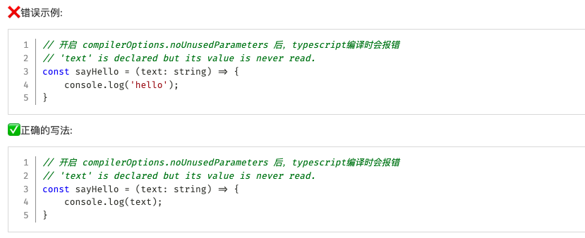 noUnusedParameters:和上面的compilerOptions.noUnusedLocals, 不同之处在于局部变量变成了函数参数。