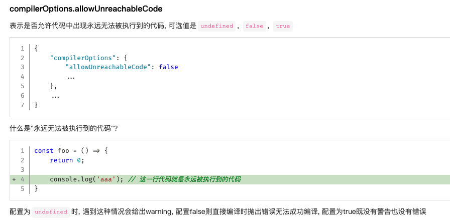allowUnreachableCode:表示是否允许代码中出现永远无法被执行到的代码;可选值是:undefined、false、true。